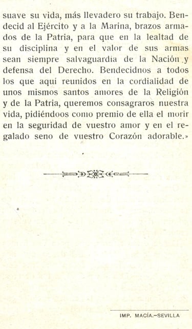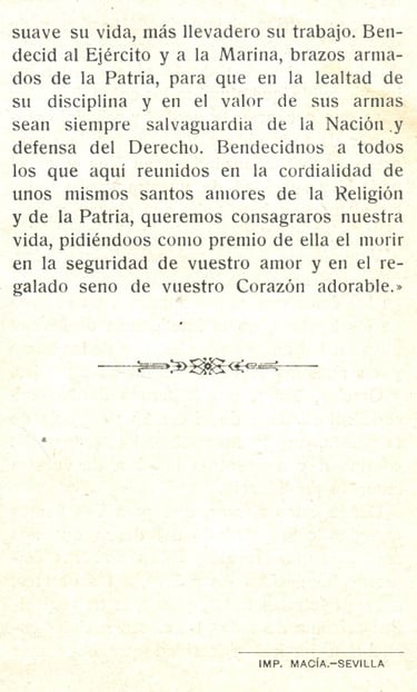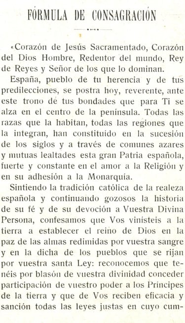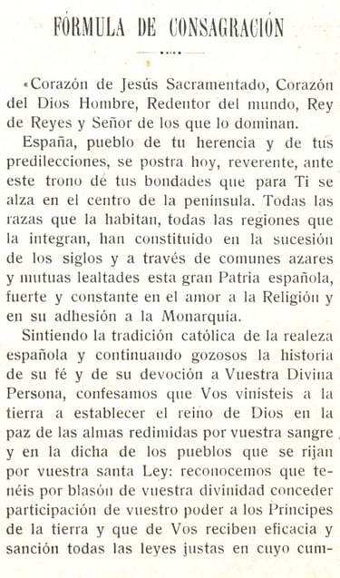 Desde estas alturas que para Vos hemos escogido como símbolo del deseo que nos anima de que presidáis todas nuestras empresas, bendecid a los pobres, a los obreros, a los proletarios todos, para que en la pacífica armonía de todas las clases sociales encuentren justicia y caridad que haga más suave su vida, más llevadero su trabajo. Bendecid al Ejército y a la Marina, brazos armados de la Patria, para que en la lealtad de su disciplina y en el valor de sus armas sean siempre salvaguardia de la nación y defensa del Derecho. Bendecidnos a todos los que, aquí reunidos en la cordialidad de unos mismos santos amores de la Religión y de la Patria, queremos consagraros nuestra vida, pidiéndoos como premio de ella el morir en la seguridad de vuestro amor y en el regalado seno de vuestro Corazón adorable.