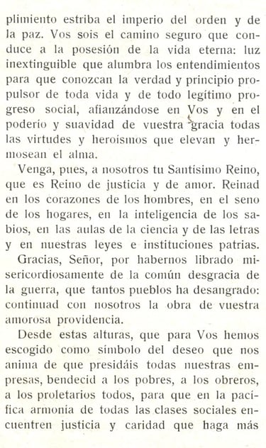“Desde estas alturas que hemos escogido para Vos, como símbolo del deseo que nos anima de que presidáis todas nuestras empresas, bendecid a los pobres, a los obreros, a los proletarios, para que la pacífica armonía de todas las clases sociales encuentre justicia y caridad que haga más suave su vida, más llevadero su trabajo. Bendecid al Ejército y a la Marina, para que en la lealtad de su disciplina y el valor de sus armas sean siempre salvaguardia de la nación y defensa del derecho. Bendecidnos a todos, etc.”